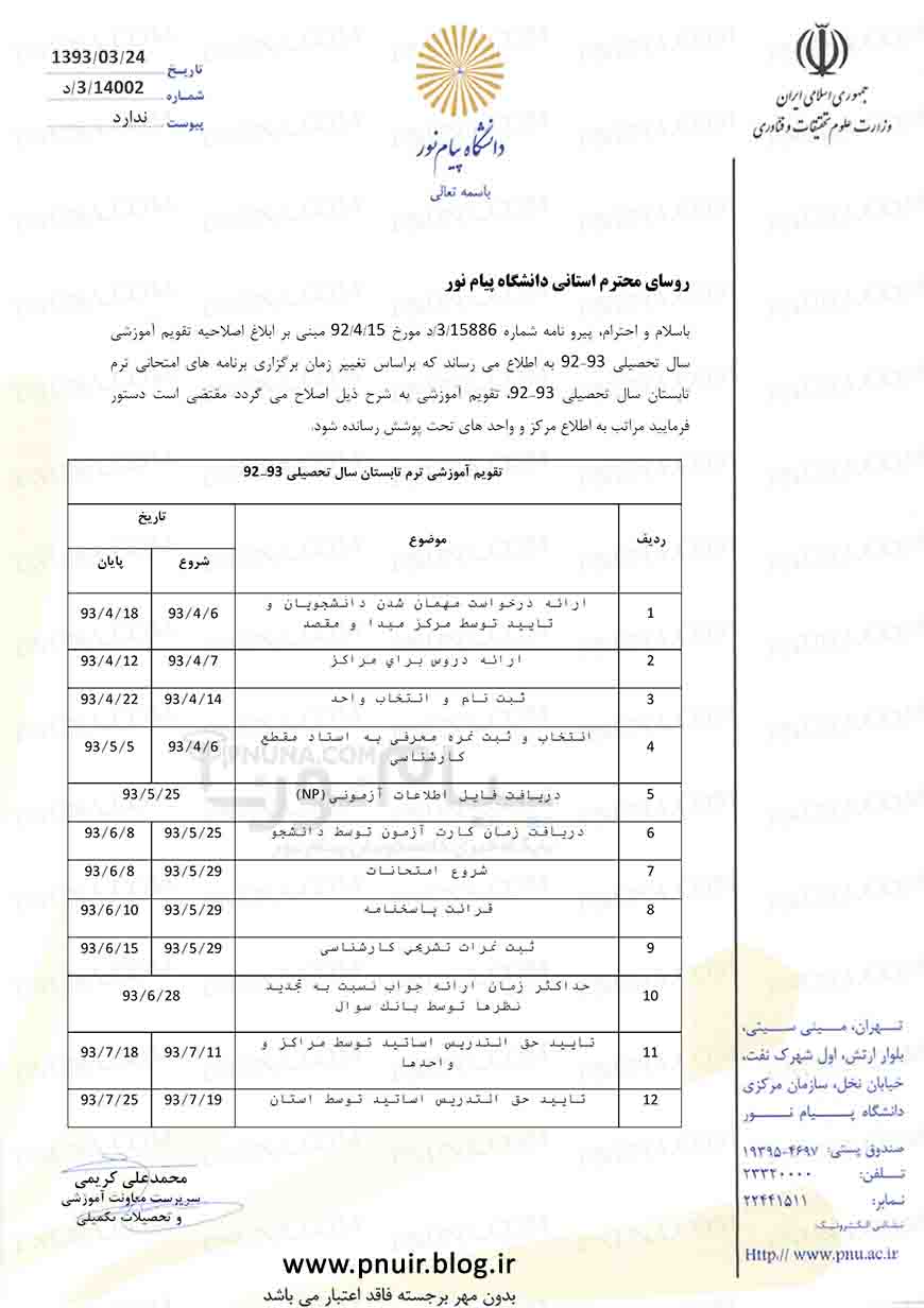 امتحانات ترم تابستان 93 دانشگاه پیام نور از 29 مردادماه 93 آغاز و تا 8 شهریورماه 93 نیز ادامه خواهد شد.